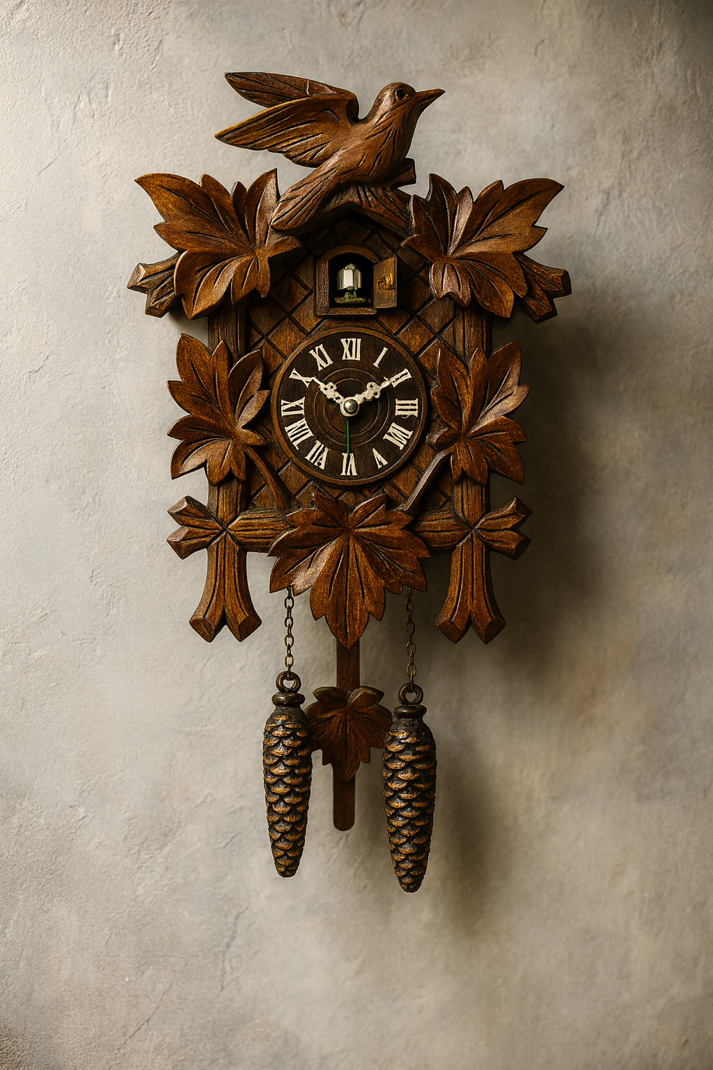 This charming Black Forest–style cuckoo clock brings nostalgic warmth and character to any room.