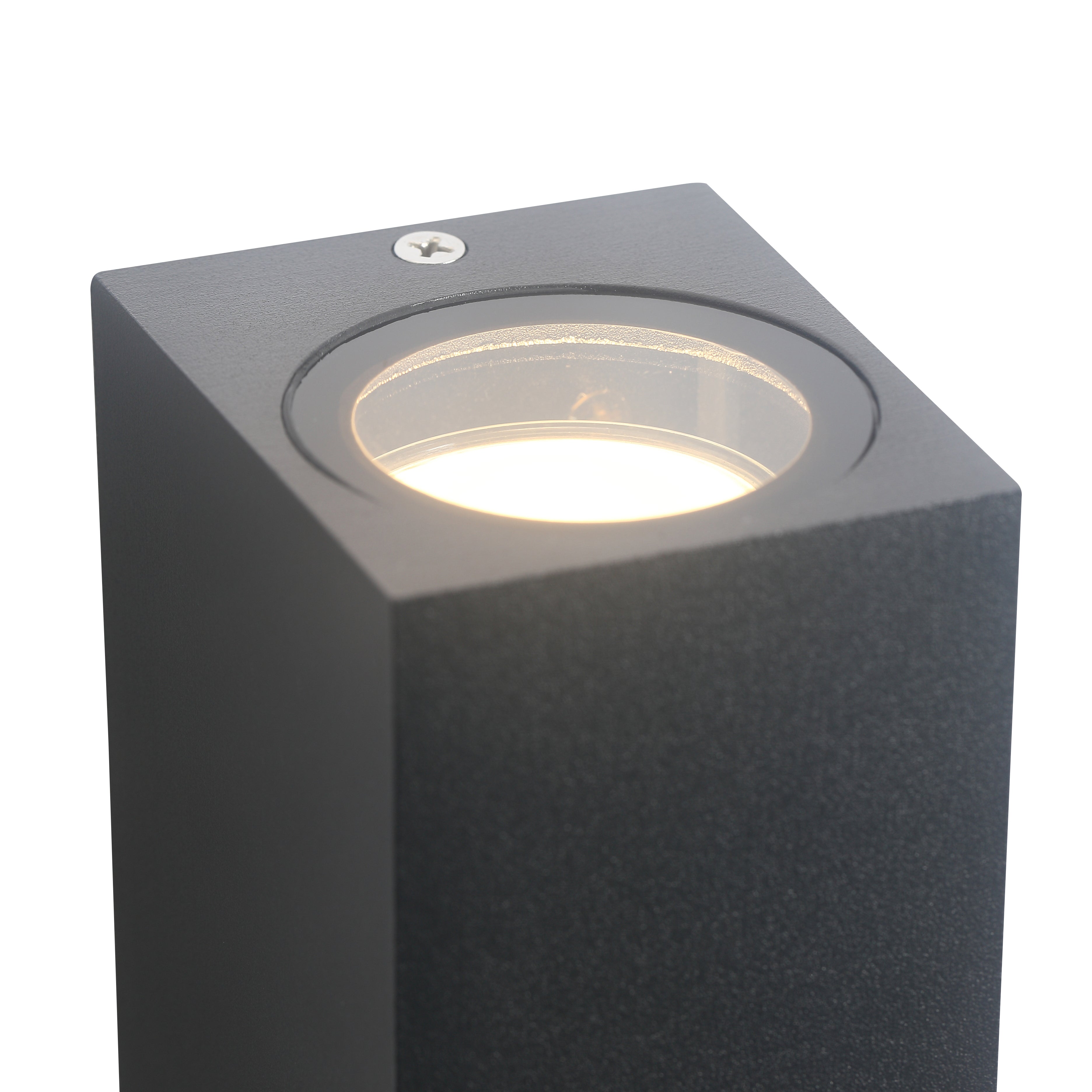 This modern outdoor wall light provides both upward and downward illumination, creating a refined lighting effect along exterior walls. Made from durable, weather-resistant aluminum, it features a clean, square design that suits driveways, facades, terraces, and entrance areas. With compatibility for GU10 LED bulbs, it offers flexible and energy-efficient lighting.